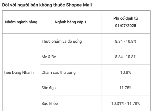 Từ ngày 01/07/2025, Shopee điều chỉnh mức phí phí cố định (đã bao gồm thuế GTGT) như sau: